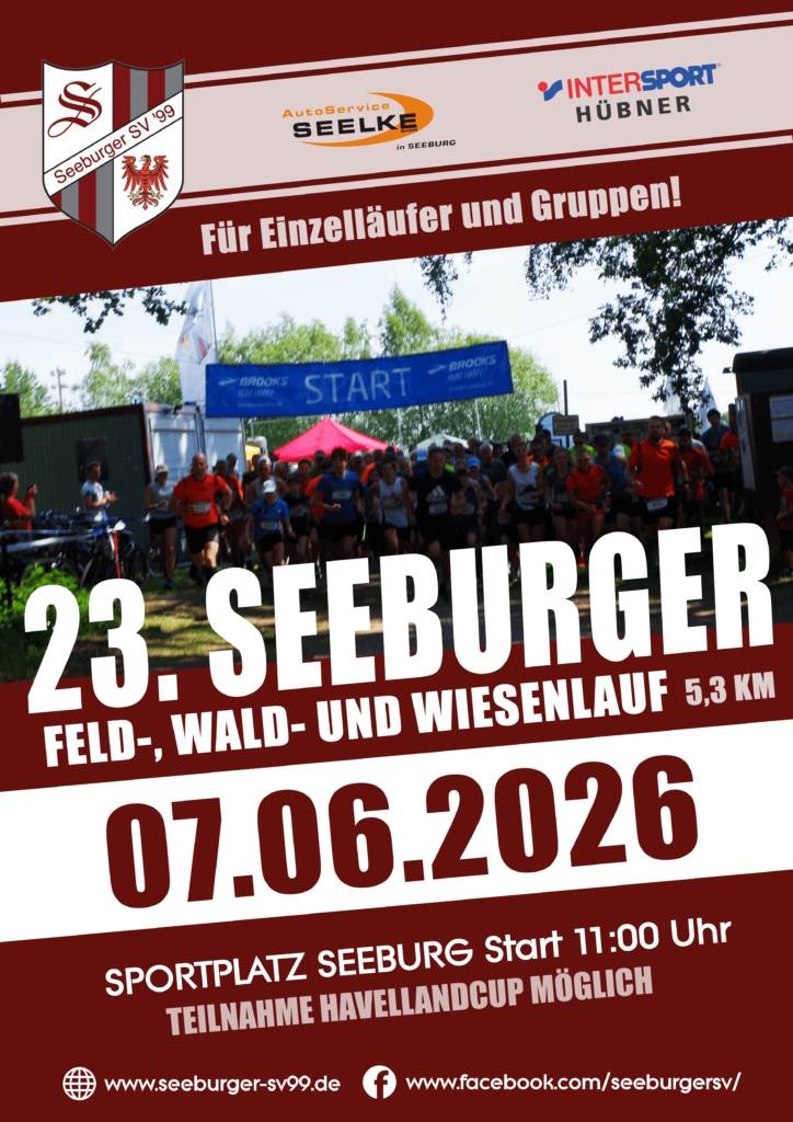 Der Start für Einzelläufer und Gruppen sowie Walker über 5,6 km ist am 07.06.2026 um 11:00 Uhr auf dem Sportplatz in 14624 Seeburg, Staakener Weg 3f. Ab 9:30 Uhr können vor Ort noch Nachmeldungen getätigt werden.